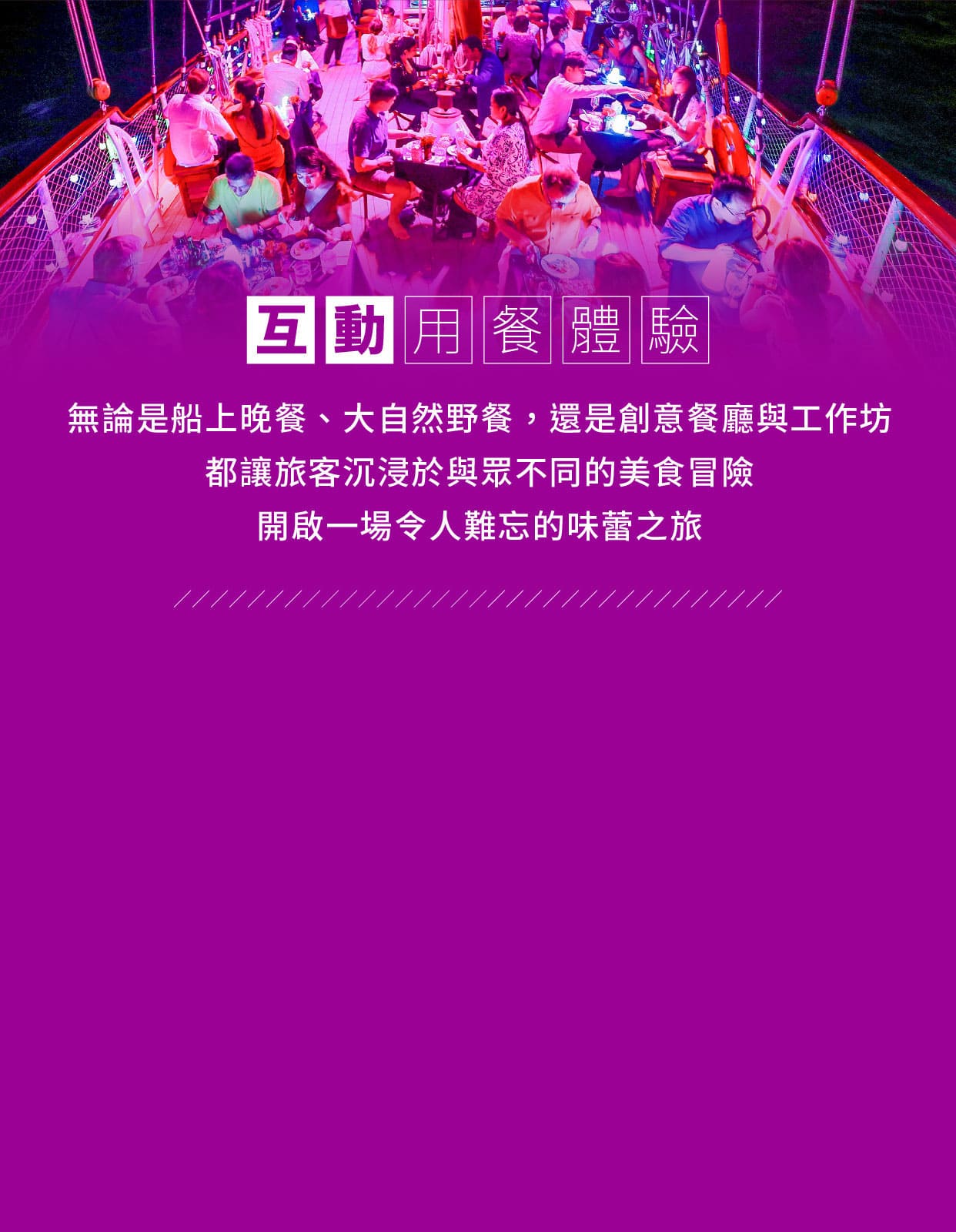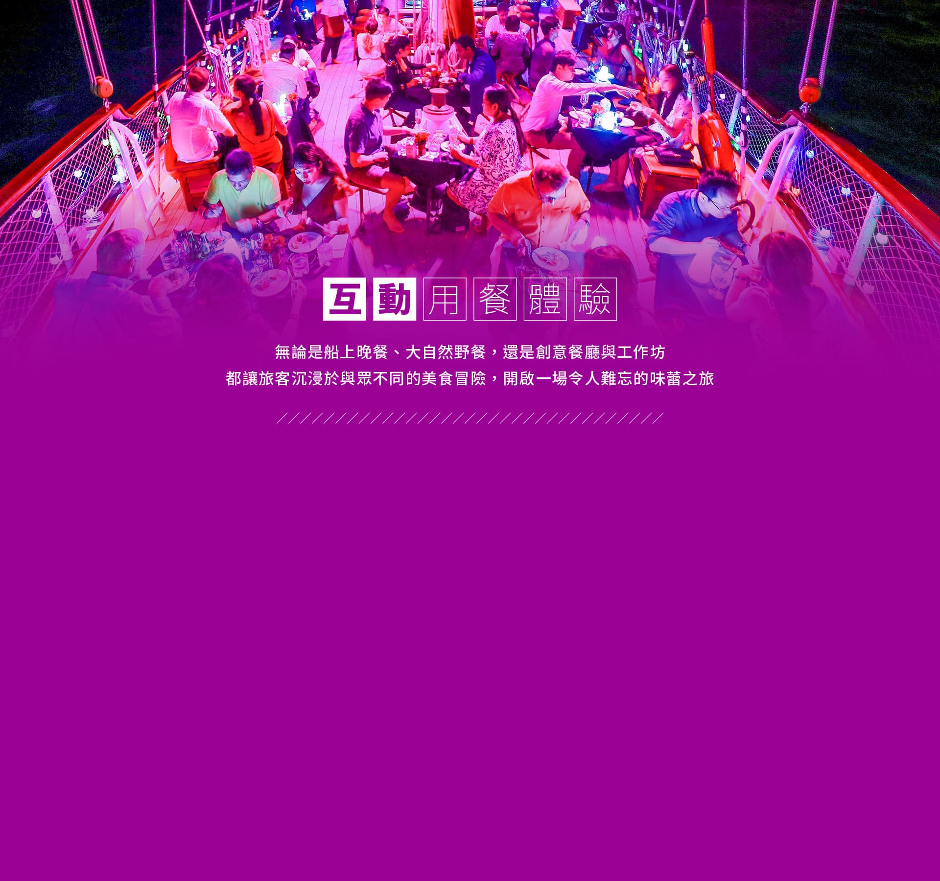 亞洲唯一提供日落晚餐航遊體驗的豪華高桅帆船,融合奢華餐飲和浪漫氛圍,讓消費者在美景中享受精緻料理,360度海景、適合尋找浪漫晚餐或精緻用餐的消費者。